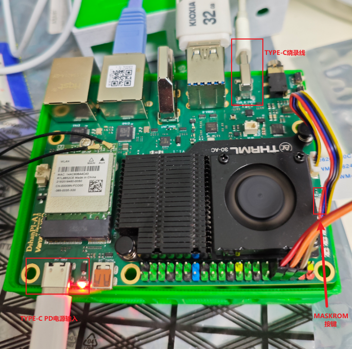 ③ 再接上电源,dshanpi-a1 就会进入 **<font style={{color: 'rgb(28, 30, 33)', backgroundColor: 'rgb(246, 247, 248)'}}>MASKROM</font>** 烧录模式;