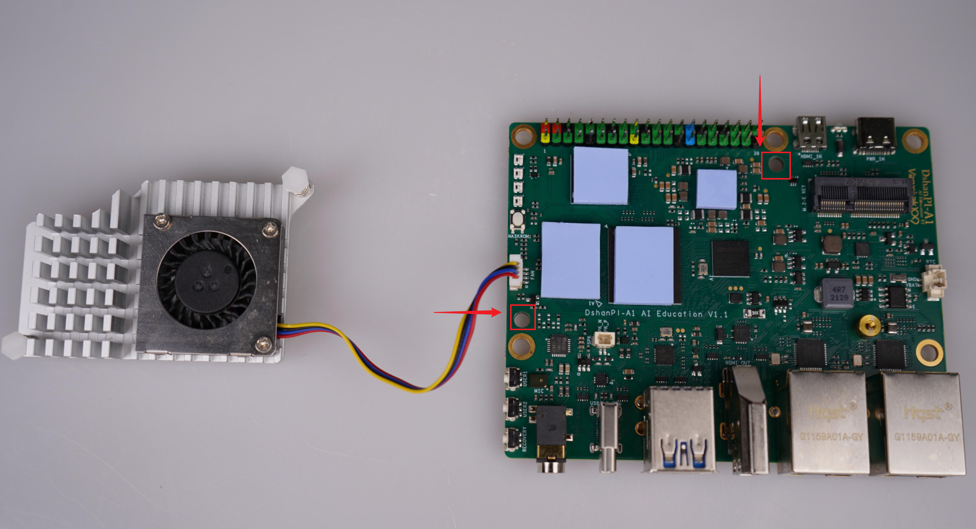- 对准孔位:将散热器底座对准开发板上的两个安装孔。