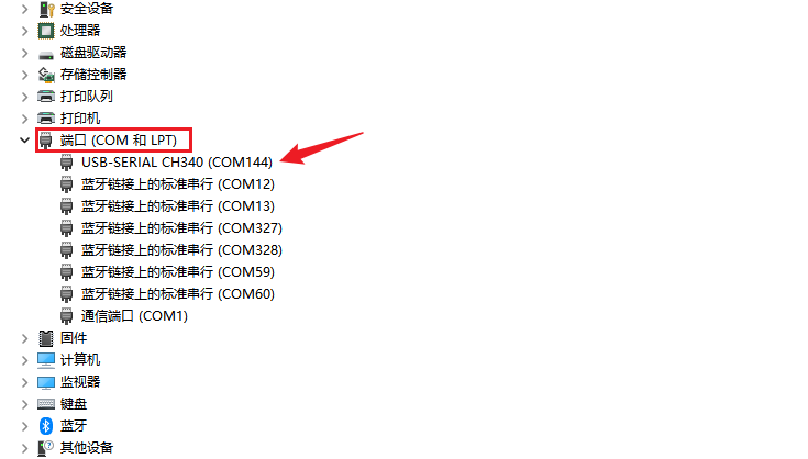 USB-SERIAL CH340),并记下其端口号(例如COM144)。