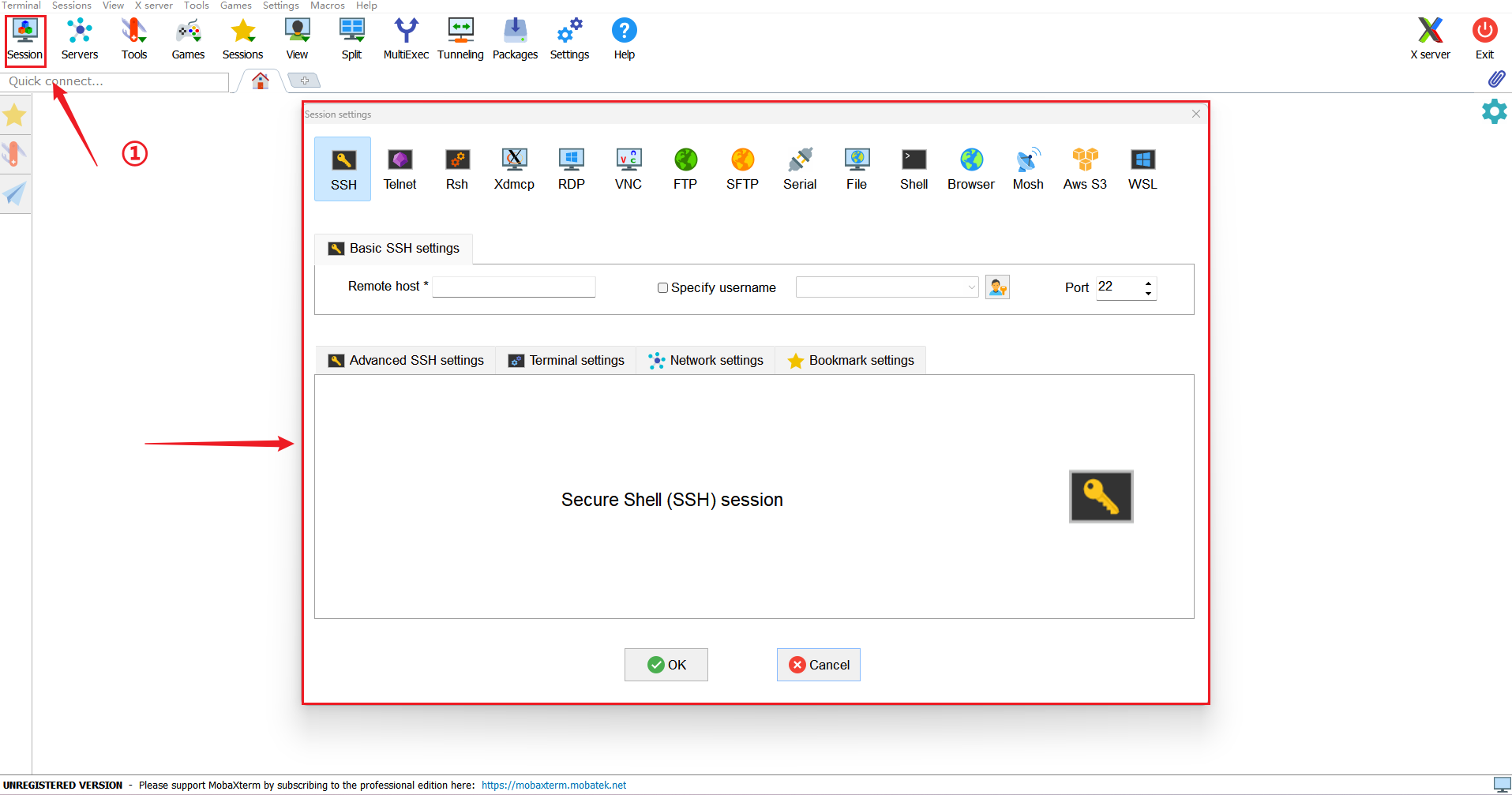 打开 MobaXterm,点击左上角的 Session (会话) 按钮,或者使用快捷键 Ctrl + Shift + N。