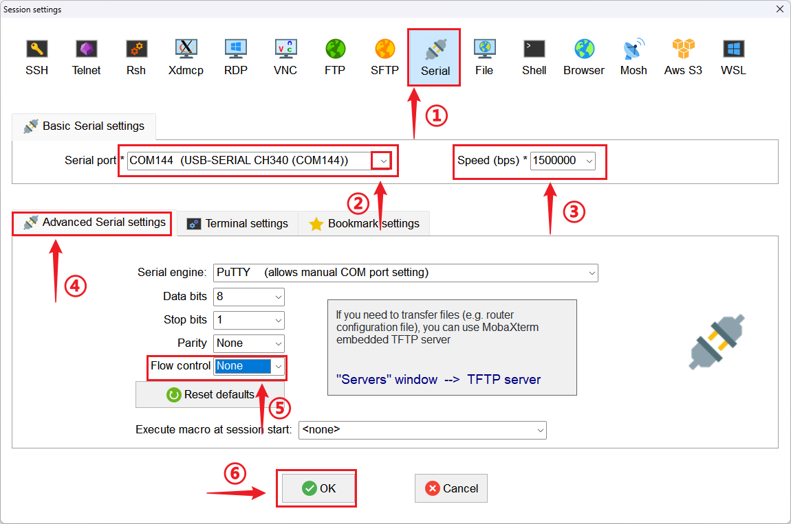 | 流控开启 | 确保 MobaXterm 中 Flow control 设置为 None。 | |